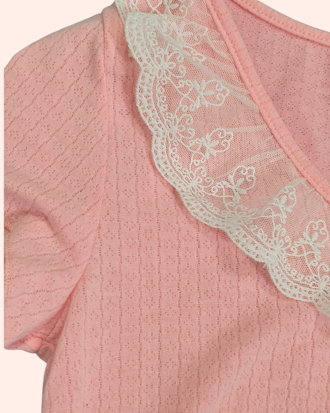 T-shirt delicado rosa con detalles de encaje blanco, lazos y botones de perla sintética.